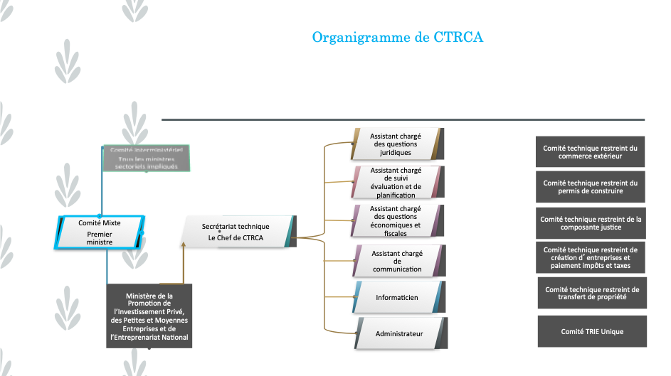 Dans le cadre des actions visant à assurer une croissance et une meilleure compétitivité à l’économie malienne, le Gouvernement mit en place certains outils institutionnels et juridiques pour réfléchir et proposer des mesures de réforme pouvant rehausser le niveau des investissements et faire du Mali un espace favorable à l’entreprenariat et aux affaires en Afrique subsaharienne. Ainsi, a été créé le Comité mixte de suivi des Réformes Etat/Secteur Privé par le décret n°09-127/PM-RM du 25 mars 2009 (modifié par le Décret n°2011-142/PM-RM du 25 mars 2011 et relu le 25 février 2015 par le Décret N°2015-0117/PM-RM).Chargé d’impulser, de contrôler ,de suivre et d’évaluer la mise en en œuvre des réforme au Mali, ce Comité Mixte dispose d’une Cellule Technique des Réformes du Climat des Affaires (CTRCA).Les activités de la cellule sont menées sur la base des indicateurs suivants :Créations d’entreprises et paiement des impôts et taxes, Obtention du permis de construire, Transfert de propriété, commerce extérieur, composante justice. A la faveur de différentes réformes adoptées suite à la création de la cellule, l’environnement des affaires au mali connaît des avancées considérables .L’occupation du 1er rang par le Mali des pays réformateurs de l’espace UEMOA pendant quatre années successives de 2011à 2014 puis en 2015 et 2017 traduit à souhait cet impact positif.